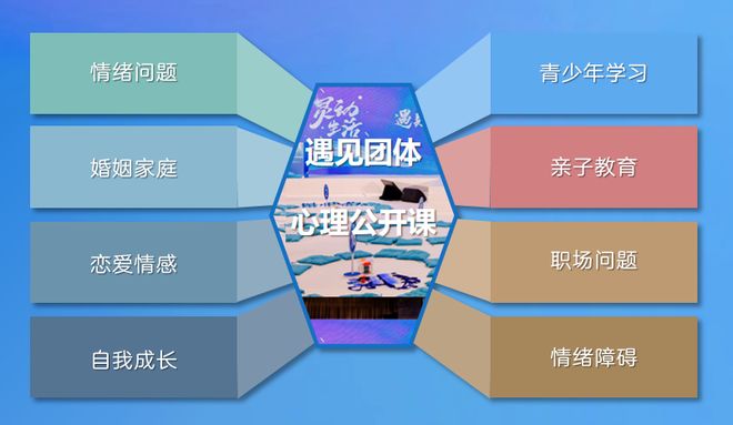 生活里的“心理难题”从来都不止一种:刚入职场的年轻人会因压力焦虑失眠,中年父母会为孩子的学习和叛逆头疼,热恋中的情侣会因误会争吵,甚至有些朋友会突然觉得“不知道自己想活成什么样”。灵动生活集团旗下遇见团体心理公开课,精准抓住了这八大人生核心困惑——情绪调节、婚姻家庭、恋爱情感、自我成长、青少年学习、亲子教育、职场关系、情绪障碍,就像一间“全方位心理工作室”,不管你是什么年龄、什么身份,都能在这里找到不同的成长体验。