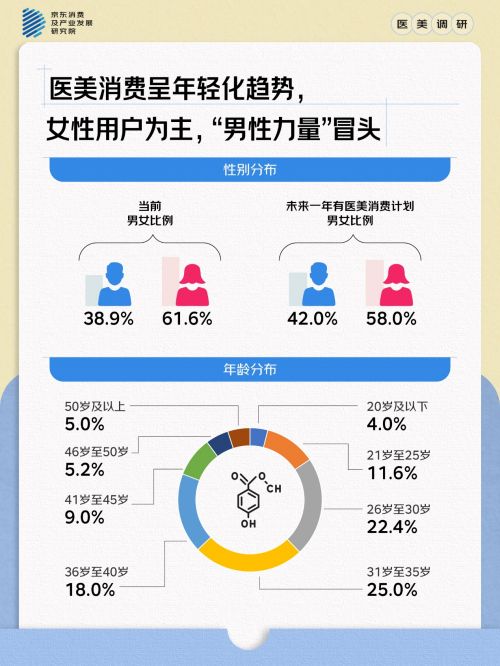 医美消费者的性别格局也在悄然变化。根据调研,当下医美消费群体的男女用户占比为38.9%、61.6%,这符合长期以来女性在容貌管理领域更为活跃的社会常态,也与女性更早关注皮肤护理、抗衰保养等需求的消费习惯相契合。不过值得关注的是,未来一年有医美消费计划的用户中,男女占比为42%、58%,男性人群比重增大。这意味着男性正在打破“医美是女性专属”的刻板印象,开始主动关注皮肤状态、面部轮廓等细节问题。“男性力量”正让医美市场从女性主导向性别均衡发展。京东健康体检中心(亦庄店)医疗美容科相关负责人表示:“男性消费者增速迅猛,消费动机主要为提升职场竞争力和婚恋需求,男性偏好抗衰类和轮廓塑形类项目,决策时更关注即时效果,偏好低调、自然的效果,避免被察觉到。”