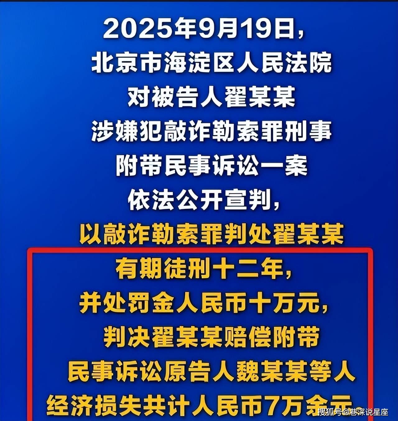 9月19日,宣判那天,法庭外挤满媒体。北京市海淀区人民法院以敲诈勒索罪判翟欣欣12年有期徒刑,罚金10万,赔偿苏家经济损失7万多。判决考虑了犯罪情节、社会危害和认罪态度,全盘支持苏享龙的民事请求。翟欣欣当庭没上诉,法警直接带走。苏享龙走出法庭,眼圈红了,这8年他跑了上百趟法院,证据一摞摞的,现在总算有个交代。