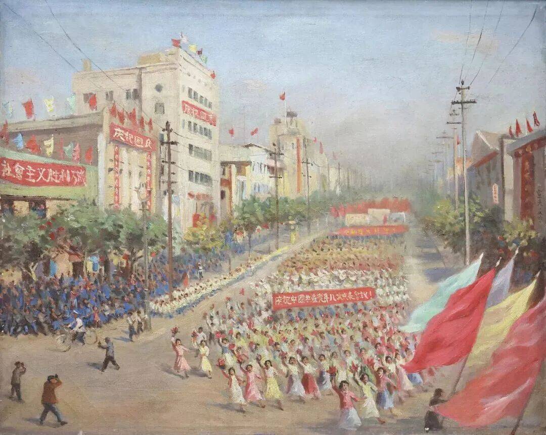 画家描绘的是1956年“十一”期间,广大民众载歌载舞、欢度国庆的壮观场景。画家摄取了南京城市中心——新街口广场北侧的一个欢庆场面:平坦宽阔的中山路上,参加的工、农、兵队伍由近及远一望无尽,此刻正在朝气蓬勃地从北向南、依序通过新街口广场。彩旗飘扬,锣鼓喧天。“庆祝国庆”“社会主义胜利万岁”“庆祝中国第八次代表会议”等字样的红幅标语,在画面中醒目可见,迎街的建筑物也披上了节日盛装。