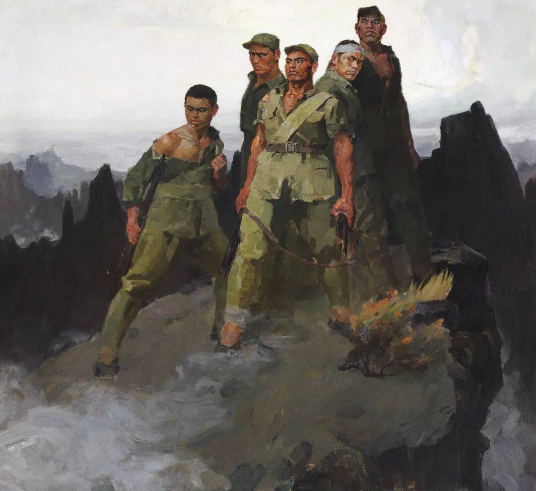 也有一类作品聚焦于中国在革命斗争中的历程,刻画了斗争中的牺牲与苦难,颂扬了坚韧不屈、奋勇向前的精神与必胜信念。例如詹建俊的《狼牙山五壮士》、罗工柳的《地道战》等,均多运用灰色调及深重沉稳的色彩,着重抒发英雄主义与理想主义情怀。这些作品不仅对当时及后世的中国人起到了深刻的爱国主义教育作用,更成为中国近现代独有的图像印记与民族记忆。