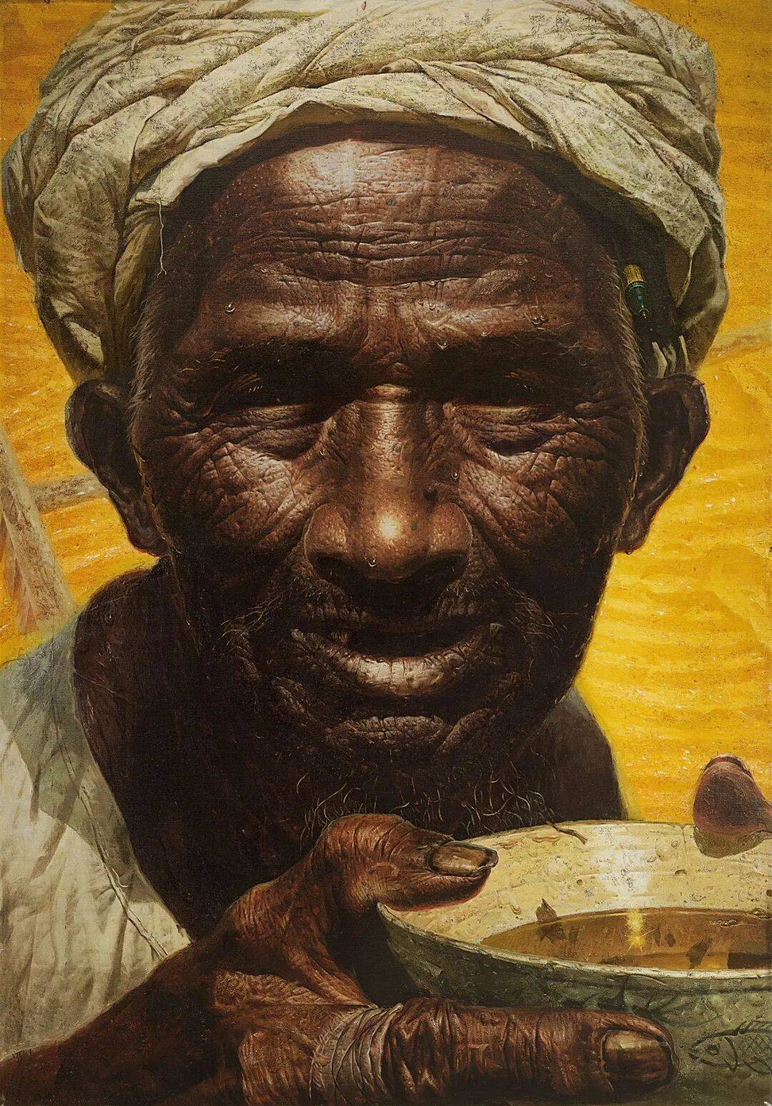这幅画以超写实的手法,巨细无遗地描绘了一位饱经风霜的中国农民。画面中的老人,每一道皱纹、每一根白发、甚至皲裂的嘴唇和指甲缝里的泥土,都清晰可见。