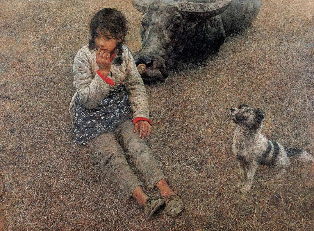 这幅作品以诗意的现实主义风格,捕捉到个体情感的微妙波动。画面中,少女斜倚在草地上,眼神迷茫而悠远,身旁的狗与牛安静相伴,整个场景弥漫着淡淡的忧伤与对未来的憧憬。