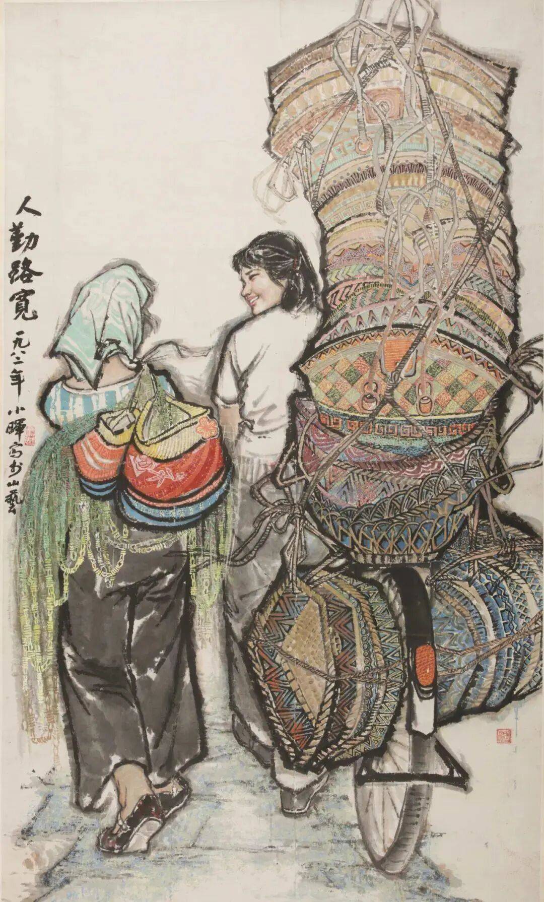 山东美术馆馆藏的王小晖作品《人勤路宽》,描绘了普通劳动者的日常场景,展现了人民吃苦耐劳、艰苦奋斗的精神风貌。作品创作于1982年,入选了“第六届全国美术作品展览”。作者巧妙地刻画了两位劳动女性的背影,并刻意突出了自行车上手编篮筐的高度,使其成为画面中首先映入眼帘的内容,点明了“讴歌勤劳”的主题。作者注重色彩的对比和运用,人物服饰以黑、白为主,挎在肩上的布包和手编篮筐则采用鲜艳的色彩。同时强化的黑色边缘线,也突显了画面的装饰效果。作者通过精巧的构图和娴熟的笔法,展现了劳动女性勤劳、乐观、积极向上的生活面貌,也成为那个时代蓬勃向上的缩影。