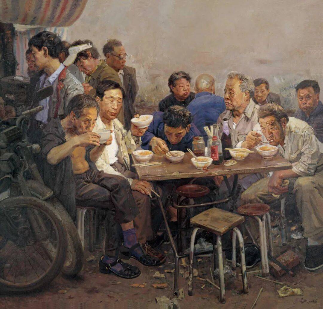 忻东旺的《早点》以细腻的笔触,描绘了城市街头早点铺里的众生相:忙碌的店主、疲惫的食客、好奇的孩童,每个人的表情与姿态都各不相同,充满了生活的烟火气。艺术家没有刻意美化或批判,只是以客观的视角记录下这些普通劳动者的日常瞬间,让观众在熟悉的场景中感受到生命的真实与韧性。