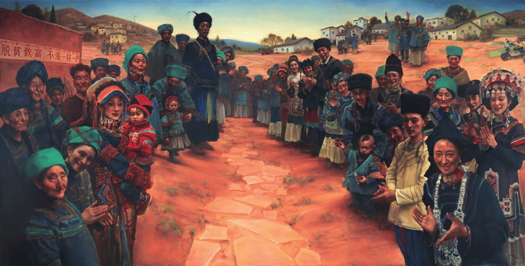 不同年龄、身份的村民在画同构成鲜活群像,既有个体的情感温度(如抱孩童妇女的温柔、老人的慈祥喜悦),又有集体的凝聚力,生动展现出脱贫攻坚为群众带来的物质提升与精神振奋,成为新时代乡村振兴、民族发展的生动注脚。